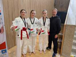Die vielen Wochen der intensiven Vorbereitung haben sich gelohnt. Am Abend des 17. Oktober ging der Flieger von Hamburg ins schöne Budapest. Da am nächsten Tag die Wettkämpfe um 10:00 Uhr starteten und die Registrierung um 09:00 Uhr abgeschlossen sein sollte, blieb am Freitag schnell der Check-Inn ins Hotel, damit man am nächsten Tag fit war. Dank der perfekten Organisation von Robert Torontali und seinem Team, konnte der Zeitplan sehr gut eingehalten werden. Für den TSV-Holm startete Maria Naumenko, Lennja Laabs und Maja Reim in den Kategorien Kata und Kumite nach WKF Regeln und wurden durch Simone Zahlmann und Mike Stengel begleitet und gecoacht. Teams aus Finnland, Norwegen, England, Italien und natürlich Ungarn konnten sich an diesem Tag freundschaftlich und wie es bei der Wado-Academy üblich ist, sehr familiär messen. Maria startete mit einer starken Pinan Nidan und konnte sich bis ins Finale durchkämpfen. Dort erreichte sie den zweiten Platz. Lennja konnte sich in ihrer Kata-Klasse bis ins Halbfinale behaupten und scheiterte dort gegen die sehr gute Gewinnerin aus Norwegen und erreichte damit den dritten Platz. In der selben Kata-Klasse konnte Maja sich souverän durchsetzen und erkämpfte gegen die Norwegerin einen verdienten 2. Platz.